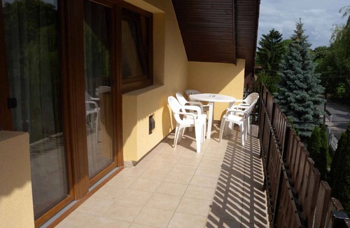 Access is via a side road (asphalted). Parking (for 5 cars) is available on the property. Specialcentral heating (gas).Facilities: internet access (WLAN). TV reception takes place via satellite. Stations in different languages. Dogsallowed, EUR 10.00/pet per day. DistancesShopping 300 m, restaurant 300 m, town center 400 m. railway station in 300 m. discotheque in 500 m. Siófok-Center 4 km. In summer: Balaton 600 m in Siofok. horse riding in Töreki 5 km. 300m Amusement park Balatonszeplak DivisionHoliday home, 2 floors, 6 rooms (including 5 bedrooms), 180 sqm, in total 16 beds. RoomThe entrance to your holiday home leads over 13 steps directly into the living room.Upper floor: Living room with sitting area and TV. Bedroom with 1 double bed, 1 single bed and access to the terrace. Bedroom with 1 double bed, 1 single bed and access to the terrace (15 sqm, garden furniture). Kitchen with gas stove, oven, fridge (icebox), microwave, coffee machine and electric kettle. Bathroom with bathtub with shower facility and 1 washbasin. Separate toilet with WC. Top floor: Bedroom with 1 double bed, 3 single beds and access to the balcony. Bedroom with 1 double bed, 1 single bed and access to the balcony (15 sqm, garden furniture). Bedroom with 1 double bed. Bathroom with bathtub with shower facility and shower. Separate toilet with WC. Terms of lease and pricesIncluded in the priceinternet access, parking place, electricity, gas, water, final cleaning, bed linen, Wireless Internet access. Side costs-Costs on the spot:/Obligatory:local tax by local tariff.On request: For a fee: heating.Deposit:EUR 300,-/object.