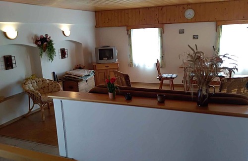 Your vacation object: The holiday house is placed on a 2300 sqm and an enclosed garden property with meadow, flowers and trees. The owner lives only temporarily in a separate building on the same estate. Relax outdoor with garden furniture and porch swing. Barbecue possibilities are available. Your holiday house: Your holiday house consists of 1 floor, 2 rooms (from which 1 bedroom), is 45 sqm and can accommodate up to 4 persons. Smoking is not permitted inside the rooms. Heating in the wood stove. The entrance leads over 5 steps. The rooms are divided as follows: Living room 28 sqm and with tiled stove and TV. You have access to the 25 sqm terrace with 1 table and 4 chairs. Bedroom 12 sqm, not heatable and with 1 double bed and 2 single beds. Cooking nook in the living room with dinette, electric cooker (4 plates), oven, refrigerator (freezer), microwave, coffee machine, toaster and electric water boiler. The dinette offers space for 4 persons. Bathroom 5 sqm, not heatable and with shower, 1 washbasin and WC. TV or radio channel can be received per satellite. Pets: erlaubt, EUR 5.00/Tier und Tag.