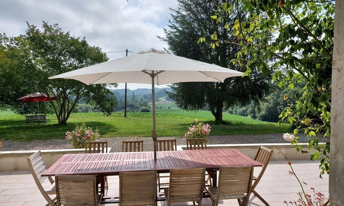 Welcome to your tranquil retreat nestled atop a picturesque valley in Aquitanien. This spacious holiday house offers a perfect escape for up to 10 guests seeking a serene getaway amidst the Chalosse rolling countryside. With its commanding hilltop location, it promises an idyllic setting for a memorable holiday, surrounded by the natural beauty of the fields and the quaint hamlet of Bergouey within reach.