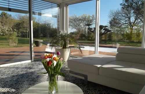 The Villa Océane stands out for its unusual design: the living room is entirely glazed with sliding windows, giving the impression of living in nature. The rooms are separated by sliding partitions. Designer furniture.