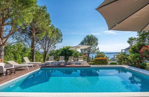 This high quality furnished villa is located in the quiet district of Dramalj/Crikvenica. Dramalj is a quiet place which belongs to the municipality of Crikvenica.The villa is equipped with many extras, with the outside area undoubtedly being the heart of this holiday villa.The rooms are divided over two floors and the top floor.Ground floor:On the ground floor there is a cozy fireplace room which is connected to a billiard room. From here you have direct access to the pool area. A few steps lead to the back of the ground floor where there is a TV room, a separate toilet and the dining/kitchen area.The kitchen leads to another terrace and the garden with a grill. A very interesting internal staircase leads from the living room to the first floor.1st floor:There are three bedrooms (one of which has a balcony) and three bathrooms.Top floor:The fourth bedroom is on the top floor and also has its own balcony.Outside area:In the outside area of this wonderful holiday home there is a private garden with barbecue, two terraces (one on the garden side and the other on the pool side), a summer arbor on the sea side, a whirlpool and a 37 m² swimming pool.DETAILED DESCRIPTION:Living area:Separate living room, dining room and kitchen are in one room, terrace, sea view, laminate flooring, carpeting, tiles, satellite TVKitchen:Kitchen, dishes, kitchen towels, electric stove, hotplates: 4, oven, fridge with freezer compartment, filter coffee machine, kettle, dishwasherBedroom:Double room with double bed, laminateDouble room with double bed, balcony, laminateDouble room with double bed, laminateDouble room with double bed, balcony, laminateBathroom:Bathroom with toilet, showerBathroom with toilet, bathtubBathroom with toilet, showerSeparate toilet with wash basinBalcony/terrace:Own balcony, covered, seating, balcony size: 6 m², own terrace, sea view, one floor below, seating, loungers, parasol, terrace size: 75 m²More information:Barbecue available, parking on the property, own swimming pool, swimming pool size: 37 m², outdoor shower, pets allowed, daily fee for pets: per day: 15.00 euros, air conditioning included in the price, fan available, bed linen available, towels available, hairdryer, Internet via W-LANPLEASE NOTE:Due to the longer cleaning time that is necessary for this large property, check-in is only possible from 4:00 p.m. on the day of arrival. Check-out is by 10:00 a.m.This villa is located in a quiet and idyllic area and is therefore not suitable for party holidaymakers and youth groups.