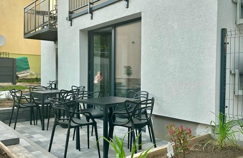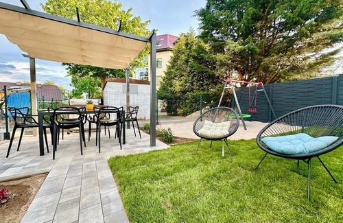 Outside behind the building there is a beautifully landscaped garden with gazebo and gas barbecue at your disposal. In the grounds there is garden furniture, a playground and parking.