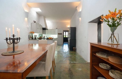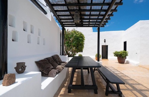 The 200-year-old farmhouse is situated on a 7,500 m2 finca (plot of land). Despite a complete remodelling, the charm and original character of this old house has been preserved. The mature garden surrounding the house is planted with Canary palms and Mediterranean plants and trees, a heated pool is located in the very private part of the second terrace and provides space for total relaxation.Guatiza is a small old village with about 400 inhabitants, which nestles harmoniously in a valley with its white houses. It is located in the lower northern part of the island and forms the backdrop for the 200-year-old, completely renovated farmhouse. The artist Cesar Manrique planned and designed an interesting cactus garden in Guatiza, making the small village famous. The villa is located somewhat off the main village road (a well-stocked supermarket is a 5-minute walk away), embedded in the typical rural everyday life of the village, and the kitchen and dining room are very spacious and laid out in one area. The green-pigmented cement floor, the large stainless steel cooker and the bright country-style kitchen offer the perfect blend of modern quality of life and original country style with a Moroccan influence. Eight people can sit comfortably at the handmade cedar wood table and the spacious living room with an integrated fireplace is very inviting. The wooden beamed ceilings in the living room are around 8 metres high. Sofas and armchairs come from Italy. There are Moroccan carpets in all rooms. The very high ceilings of the individual rooms with their original plastered walls create an open and pleasant ambience and emphasise the harmoniously designed interior. You will find a successful, stylish and comfortable feel-good atmosphere.in the front area is a patio with heated pool. This area is not visible from the outside and therefore creates a very private atmosphere. An old olive tree, planted tubs and a pergola with a wooden table and seating complete the picture. There are also four wooden sun loungers and a gas barbecue. At the rear is a large garden with mature trees, an exotic mix of flowers and wonderful views of the volcanic mountains. You can also admire unique sunsets from the spacious wooden terrace. The exclusive villa with its harmonious integrity of old and modern offers the perfect setting for a quiet, relaxing and comfortable holiday.in the double garage with automatic garage door there are mountain bikes, a surfboard and a boogie board as well as tennis rackets and 2 sets of golf clubs. In addition to a sauna, there is a fully equipped fitness room. In the adjoining laundry room there is a washing machine and ironing equipment. The following baby items are also provided at no additional cost: