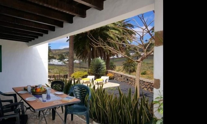 Villas Finca La Crucita spreads over a surface area of 7,500 square metres and is situated in the village of Haria, in the north of Lanzarote. Villas Finca La Crucita is surrounded by over 50 palm trees, the majority of which are over one hundred years old, and it is set in a valley in which thousands of these species. Villas Finca la Crucita with 2 bedrooms is equipped with 1 double King size bed,2 twins, 120 sq. villa, living room, 2 bathrooms, terrace, shared the outdoor pool with solar panels and **Pool heated in winter-time 01 October until 01. April**, Pre-paid air conditioning, free parking and free wifi in communal areas.The country estate La Crucita spreads over a surface area of 7,500 square metres and is situated in the village of Haria, in the north of Lanzarote. A 2002 census showed a total of 1,189 inhabitants in the village. La Crucita is surrounded by over 50 palm trees, the majority of which are over one hundred years old, and it is set in a valley in which thousands of these species thrive. The estate boasts eight houses, each one different from the other, and they are fully equipped, whereby one of them is the main house and has a surface area of over 500 square metres. Each one bears the name of a village in the municipality; Haria, the main one, Yé, Máguez, Orzola, Tabayesco, Arrieta, Mala y Guinate. The estate and the houses have been designed for the disabled, free of obstacles and architectural barriers. Apart from the houses and open spaces at La Crucita, there is a garden area containing some twenty palm trees and an area of bbq area. Building Style The building style of the houses on La Crucita finds its inspiration in the traditional architecture of Lanzarote. The chimneys- up to 8 different ones-, the earthenware and wooden floors blend together with generous use of carpentry in the ceilings, doors, windows and floors.Keeping with traditionIn keeping with tradition, special emphasis has been placed upon the gardens, with some plants exclusively from the island and from the Canaries, whilst others are from other places. All the houses are furnished in a rustic style, have wooden wardrobes rather than built-in cupboards and are equipped with a ceramic hob, oven, satellite television and automatic washing machine.Places of InterestFour of the seven Centres of Art, Culture and Tourism are based in the municipality of Haria, such as The Cueva de los Verdes, the Mirador del Rio, Jameos del Agua and the Cactus Garden. The last three of these are the creations of Cesar Manrique, who spent the last years of his life in Haria. Mirador del RíoThis is a unique construction excavated from within the hillside and is situated in the massif of Famara, the Peñas del Chache, which rises to nearly 700 metres above sea level. The Mirador offers a panoramic view of the islands which make up the Chinijo Archipelago, La Graciosa being the principal island, with Alegranza and Montana Clara in the background.Cueva de Los VerdesA volcanic cavern of several kilometres in length, illuminated to highlight the various forms and colours of the molten lava during its passage to the sea. The former residents took refuge in the cavern during pirate raids on the island.Jameos del AguaAn underground lagoon, which is home to blind albino crabs, with hanging tropical gardens and a stunning lagoon swimming pool, the Jameos del Agua also houses an underground auditorium and a museum with a permanent exhibition about volcanoes.Jardin de CactusA garden without comparison in the world, there are 10,000 cacti of more than 1,400 species contained within its walls. Similar in design to a Roman amphitheatre, the garden is formed of several levels of volcanic stone beds.In the municipality of Haria, there are also the Salt flats of Gusa, at the foot of the Famara massif and the Wind Park at Los Valles, which generates some of the island’s electricity.Playa del RiscoThe beach at El Risco is reached by descending from the summit of the massif of Famara, from an altitude of almost 700 metres, down to sea level by means of a two-kilometre footpath. It takes almost half an hour to descend. The beach has one of the most beautiful backdrops with the cliffs of the massif behind it. To ascend by the same pathway takes about an hour. With golden sands and a calm sea, it is isolated and lies within a nature reserve, looking out onto to the narrow stretch of sea, El Rió, which separates Lanzarote from La Graciosa.Playa La GaritaThis beach is situated in the village of Arrieta. It has golden sands and is sheltered from the prevailing wind and waves. It has numerous facilities: changing rooms and toilets, a breakwater, restaurants right next to the beach and a Red Cross station...Caletón Blanco Is situated very near to the village of Orzola. It’s an attractive beach thanks to the vivid colour contrast: the whiteness of its sand, the intense turquoise of the sea and the black volcanic lava. Caleton Blanco is only 15 minutes drive away from the estate of La Crucita.Natural Spaces :The Malpais of La Corona volcano – the lava fields surrounding the highest volcano on the island.The Protected Zone of Teneguime.Site of Scientific Interest at Jameos del Agua.Haria is a natural reserve of biodiversity on the island. Protected by the Law for Natural Spaces, the hillsides of the Famara massif have been found to contain the highest number of indigenous botanical species per square metre in the whole of Europe.