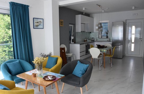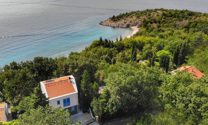 Newly built (2017) and spacious designer villa with great views of the Adriatic sea. Pathway through a Mediterranean garden to a private sundeck with access to a beautiful pebble beach