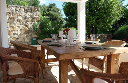 The very comfortably furnished house has three bedrooms on the first floor, each with a double bed (180 x 200cm) and air conditioning, as well as a bathroom with a bath. The ground floor has a shower room and a living and dining room with an open kitchen and a wood-burning oven. The air-conditioned living room opens onto the roofed terrace with another dining space and a cosy lounge. The pool directly adjoins the terrace and is open from the beginning of May to the end of October. There is also a courtyard sheltered from the wind, with sun loungers and a hammock. A charcoal grill is available. The property is not fully fenced.