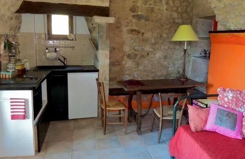 The third building is a small tower that was originally used for wine production. This 'guest house' is at the end of the garden and sleeps 3 people. Upstairs, there is a double bedroom with en-suite (via a staircase) access to a modern bathroom under the roof. On the ground floor, there is a stone vaulted room with a single bed and a kitchenette. The terrace in front of the tower offers great views, has an outdoor shower and invites you to relax.