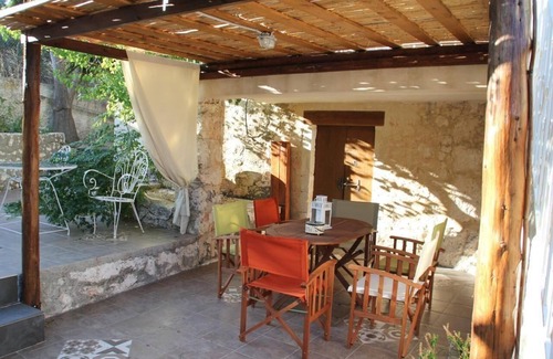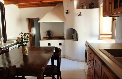 An old stone staircase leads to the big outside balcony on the first floor, where you can have your breakfast in the morning watching the nice view around or enjoy your drink at night watching the millions of stars in a clear sky. As you enter to the house, there is on the right side, The master bedroom with king size bed facing from the window the outside alea and the hill across, while from the inside bathroom's window the view to the village and the sea is catching your eye. On the left side of the floor exist Another double bedroom and A two single beds room sharing a bathroom. In between the bedrooms there is the living-dining room and kitchen place where you can enjoy as well the 42 inches flat satellite TV either laying in the huge couch or sitting in the Chesterfield leather sofa.