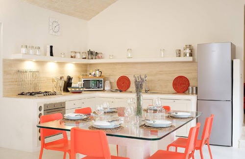 The villa is only 40 minutes from Brindisi airport and 1.5 hours from Bari airport. An ideal base for exploring the Unesco World Heritage Sites of Alberobello and Matera. Our holiday home is located near Cisternino, Ostuni and has been designed with style and comfort in mind to make your holiday as relaxing and enjoyable as possible.Villa Vesta was started in 2005 and completed in August 2007 in true Italian style. Completely restored in 2021. The villa consists of 6 lamia. The plot is approximately 19,000 square metres and is rich in olive trees and bordered by beautiful and typical dry stone walls, the driveway lined with lavender and rosemary leads past a shady car park to the front of the villa. A beautiful old olive tree is the centrepiece of a small turning circle.The main entrance at the front of the villa is gently shaded under trailing wisteria...We think holidays should be as relaxing and stress free as possible and we have designed and furnished our beautiful home with this in mind.Enter through the front door directly into the spacious open plan kitchen and open plan dining and sitting area. The kitchen and living room form a well-proportioned area in the centre of the villa.