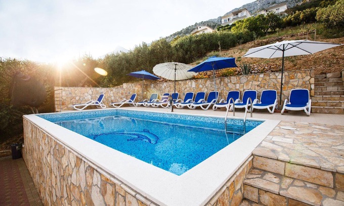 The house is located in the small fishing village Pisak, right on the coast. This new luxury villa has three floors, a comfortable environment. The floors are identically equipped. There is a living room, two bedrooms, a kitchen, a bathroom and terraces are also available from (ca. 12 sqm-35 sqm). The living room is equipped with comfortable chairs, LED TV, DVD and CD player and radio. The kitchen impresses with oven, four plate stove with ceramic hob, toaster, microwave, coffee maker, kettle, dishwasher, refrigerator, knives, and high-quality cutlery and cooking equipment. The bathroom has a sink with a large mirror, a toilet and a hydromassage shower are the massages at the request back and feet. The shower room has in addition a rain shower, radio, light and steam sauna (2 showers). 5 rooms with double beds equipped with the Great of 200x160cm, 200x90cm one room has two single beds. In every room of the villa has 1 air conditioner. Each floor has a separate entrance via an external staircase of granite. Due to the construction of the villa has a beautiful view from anywhere on the sea, islands and mountains. Throughout the house Internet is available (Wi-Fi). Behind the house there is a swimming pool with a size of about 30 m². The pool is surrounded by olive trees, so there is complete privacy for guests. The outdoor terrace is about 85 m2 large and equipped with high quality loungers and parasols and a barbecue. Between terrace and pool is a Jacuzzi for five people which provides relaxation. Pool and hot tub are 'Multicolor' lit. Parking is available directly in front of the house. In the resort there is a supermarket, a small fruit and vegetable stand, a cafe and two small restaurants with typical Dalmatian cuisine. Doctor, pharmacy, post office, ATM and other shops can be found 15 km away in Omis or Makarska in 18 km away. Thanks to the nearby Omis and Makarska, you can do all sorts of sports, visit neighboring excursion places and learn about cultural and historical heritage of the area. For those who yearn for pleasure, Makarska and Omis offer with bars, cafes and night clubs a welcome change. Because of the mild climate, you can swim from May to October in Pisak. In the pre-season and post-season (May, June, September, October) Pisak is particularly attractive because not as crowded. Other activities include rafting on the river Cetina, mountain climbing and hiking on the mountain Biokovo and diving. The international airport un the exciting city of Split is only 40 km.Short descriptionOther : Non-smoking houseShort description 1Number of kitchens : 3Living room 1Other living room features : Comfortable sofa, a small table, dresser, mirror, chest of drawers, LED-TV, satellite-TV, DVD, CD, MP3, cassette, air conditioning.Bedroom 1Other bedroom furniture : Double bed, wardrobes, bedside lamps, mirrors, air conditioning.Bedroom 2Other bedroom furniture : Double bed, wardrobes, bedside lamps, mirrors, air conditioning.Bedroom 3Other bedroom furniture : Double bed, wardrobes, bedside lamps, mirrors, air conditioning.Bedroom 4Other bedroom furniture : Double bed, wardrobes, bedside lamps, mirrors, air conditioning.Bedroom 5Other bedroom furniture : Double bed, wardrobes, bedside lamps, mirrors, air conditioning.Bedroom 6Other bedroom furniture : Two single bed, wardrobes, bedside lamps, mirrors, air conditioning.Living room 2Other living room features : Comfortable sofa, a small table, dining table, 4 chairs, chest of drawers, LED-TV, satellite-TV, DVD, CD, MP3, cassette, air conditioning.Living room 3Other living room features : Comfortable sofa, a small table, dining table, 4 chairs, chest of drawers, LED-TV, satellite-TV, DVD, CD, MP3, cassette, air conditioning.Kitchen 1Other kitchen equipment : Microwave, toaster, Kaffeaparat, knife set, cutlery for eating and cooking, dishwasher, kettle,Kitchen 2Other kitchen equipment : Microwave, toaster, Kaffeaparat, knife set, cutlery for eating and cooking, dishwasher, kettle,Kitchen 3Other kitchen equipment : Microwave, toaster, Kaffeaparat, knife set, cutlery for eating and cooking, dishwasher, kettle,SurroundingNearby sports facilities : Canoeing, Climbing, Diving, Fishing, Paragliding, Rafting, Rowing, Water skiingRental Facilities : Boat rental service, car rentalSurrounding 1Excursion possibilities : Every day there is a ferry islands of Brac, Hvar and Peljesac half. Other excursions are Krk National Park to visit with its beautiful waterfalls. And yet many possibilities furtherLocation description : Pisak is a small fishing village on the coast, just 40 km from Split (international airport) and 18 km from the towns of Makarska and Omis entfernt.Im village has a small supermarket, a small fruit and vegetable stand, 1 cafe and two small restaurants with typical Dalmatian cuisine. Doctor, pharmacy, post office, ATM and other shops can be found in the 15 km distant Omis or Makarska, 18 km ennferntem. Thanks to the nearby Omis and Makarska, our guests can enjoy numerous active sports, visit the many neighboring excursion places and learn about cultural and historical heritage of the area. For those who yearn for pleasure, being close to Makarska and Omis make me its bars, cafes and night clubs for fun, variety. Because of the mild climate, you can swim from May to October in Pisak. In the pre-season and post-season May, June, September, October Pisak is particularly attractive because not as crowded. Other Activities: Rafting on the river Cetina, mountain climbing and hiking on the mountain Biokovo, diving. COME AND ENJOY CROATIAOther leisure facilities : The discos are located around 10-20 km.Garden and outdoorGarden facilities : Garden furniture provided, Grill, PavilionOn-site leisure facilities : Outdoor swimming pool exclusive use, Steam bath, Swimming pool, Whirlpool