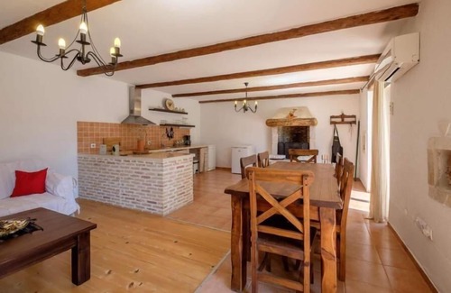 The villa's interior mirrors the elegance of its external stone facade, with spacious living quarters that have been thoughtfully designed to cater to your comfort and convenience. The ground floor unfolds into a generous 50m² living and dining area, featuring an open kitchen fully equipped with modern appliances, including air conditioning, a dishwasher, a ceramic hob, and a microwave. The comprehensive renovation in 2020 emphasized the retention of traditional elements, lending the space a particularly pleasant atmosphere. The upper floor comprises two comfortable bedrooms, each with air conditioning, a ceiling fan, and an ensuite bathroom, offering private retreats that promise restful nights.
