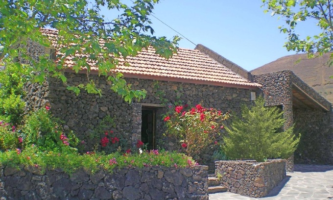 Rural house with garden area, wild land at the back surrounded by stone boundaries where you can enjoy the peace and tranquillity of the island of Meridiano. Picturesque rural house in El Hierro with a façade covered with lava from the extinct volcano "Montaña Chamuscada" that presides over the area. Comfortable covered stone porch with barbecue and terrace area to enjoy outdoor barbecues either romantically as a couple or for fun with the family. Impressive location to enjoy the starry sky of El Hierro, one of the best places in the world to see the stars, "Starlight Tourist Destination" where you can clearly distinguish the constellation of Taurus.