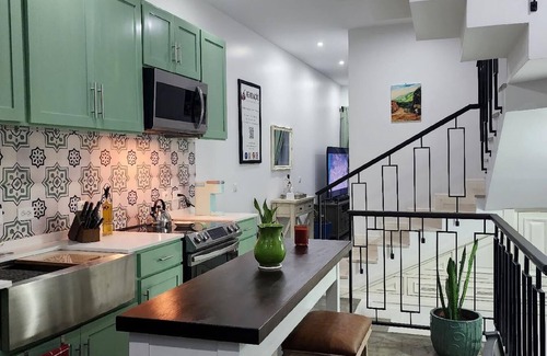 This vacation home features a fully equipped Kitchen, living room, and 1 half-bath on the ground floor. With 3 bedrooms with air conditioning, bed linens, smart flat-screen TV, and 2 full bathrooms with towels and walk-in showers on the upper floors.