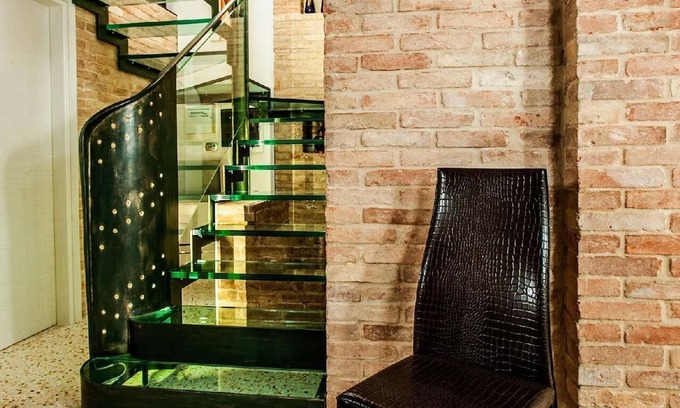 All details have been carefully considered to keep the original rustic structure and to enhance the principle materials: brick as the main element found not only at the front but also in various nooks and crannies; the wrought iron of the stairs; the wood of the interiors and bathrooms and especially of the beams. The ensemble harmonizes with elements made of glass, which add a touch of modernity and pay homage to nearby Venice.
