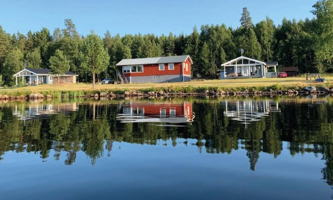 Just on the lake shore with a very large grass area around, lots of fish in the lake for fishing lovers, ramp for the boats and for sunbathing or swimming. Each house has his own picnic wooden table in front of it.Very nice and peaceful area for walking and enjoying the forest.The closest village to Svärdsjö where you can shop and dine is about 13 km far.