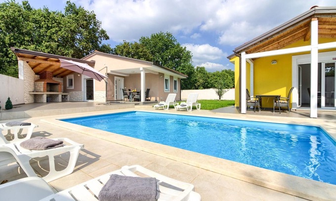 Villa Trusina are two separated houses located on the same plot perfect to offer a nice holiday away from the city crowd and neighbours. Both villas and their location is the guarantee of a great holiday for two families or two groups of friends who wants to spend their holidays together but in the same time to have privacy. The bigger, brown house, has two bedrooms with two bathrooms, while the yellow smaller one has one bedroom and one bathroom. In both houses are living rooms and kitchens with direct acces to covered terraces and pool.The grill will offer you the perfect place to prepare delicious food and the possibility to spend a lots of time together and share wonderful moments in Istria. Free parking spaces inside the plot are available as well. Youth groups are not allowed.