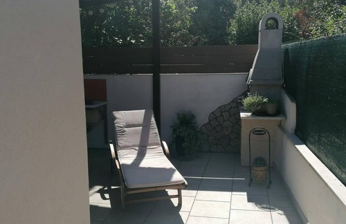 This is a small house with a beautiful private terrace. It is around 40m2 in size and it has fully equipped kitchen with oven, coffee machine, microwave and dishwasher. There is a dining area and living area all in one with flat screen TV and free WiFi in whole house. The air condition is also included in price. There are two bedrooms, one has double bed and another one has one single bed. Bathroom has a shower, sink and a toilet. Terrace has a sink and outside shower. There is a barcecue, too.