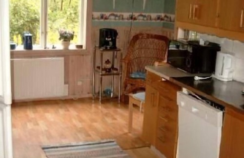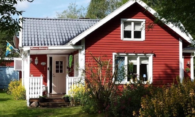 The house with a typical Swedish wooden construction, a red exterior facade with white edges and windows, and providing around 80m² of living space, can accommodate four people and there is also a guest house for two people. The house has a bathroom with a shower, WC and washing machine. The kitchen has a dining space and access to the garden and is equipped with a fridge, microwave, freezer, stove, extractor fan and dishwasher, as well as other appliances (toaster, kettle, espresso machine, bread cutter). The living room is comfortably furnished. It has an open fireplace, a radio, an LED TV with a satellite receiver. You go through the living room to the conservatory with access to the terrace and the garden.