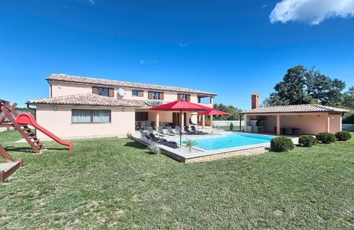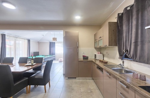 The spacious villa Amber is located in central Istria. On a property of 1800m2, this large villa can accommodate up to 14 people in 5 bedrooms and 2 living rooms. A large swimming pool and a fenced yard guarantee a relaxing holiday. The special feature of this house are the facilities (billiards, swimming pool, table tennis) and the proximity of famous tourist places in Istria to only half an hour by car. The villa is fully equipped for longer stays of guests, and the recommendation is two families or groups. Pets are welcome. On the property there is a parking lot for up to 7 cars. The preserved nature of Istria, many Istrian taverns and restaurants nearby, indigenous Mediterranean dishes and good wines provide visitors an unforgettable experience. It is recommended to visit the small family restaurant Ferlin, only a 15-minute drive away, where you can enjoy exclusively local specialties.