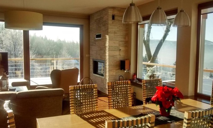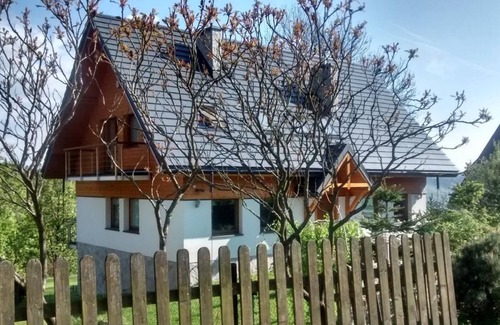 Willa Jasien, high standard holiday house is placed in the heart of picturesque Żywiec Landscape Park, close to many hiking trails and in direct proximity of Zwardoń-Ski station, equipped with 4 person-chairlift. Near upper station of the lift, 10 minute walk from house, there is a family-run tavern Swojskie Klimaty, when you have a taste of exquisite Polish cuisine. Every room come with bathroom and balcony (except one single-bed room).On the ground floor, spacious living room with kitchen annex (common space of 50 square meters), flat screen with satellite TV, HiFi audio set (MP3 with USB port), wireless internet connection, fireplace, large terrace overlooking the valley. On the lower floor there is 8 ft pool table (with possibility of conversion to ping-pong table), infrared sauna, Turkish bath and ski room.Mini-playground for children (2 swings, slide, trampoline and 2,0x1,2 m inflated pool in the summer time)in the garden behind the house. Carport with 3 parking spaces. Whole 1400m2 terrain is fenced, 24h video surveillance on the outside, secured by Skorpion security agency.The house is situated at 814m ASL, between Mały Rachowiec and Rachowiec peaks. Asphalt road connection provided, 4 km from S1 Bielsko Biała-Żylina freeway, 5 km from Slovakian border, which makes it an excellent getaway base for hiking in Silesian and Żywiecki Beskid mountains and also Little and Gross Fatra mountains in the Slovakia. We are about 100 km from Cracow and from Auschwitz.From September 2017 You can reach our house by NEW ASFALT ROAD from Zwardoń (see picture)There are many attractive ski resorts in the vicinity, such as Wisła, Ustroń, Szczyrk, Istebna and Slovakian Velka Raca.Willa Jasien is excellent choice for persons who are tired with city tumult and who seeks a quiet place to rest in the harmony with nature and experience a breath-taking mountain views.To assure our every guest a high level of comfort, smoking indoors is strictly prohibited (there is assigned covered place with ashtray in the lower level, garden side).Single pets accepted.Short descriptionOther : Non-smoking houseShort description 1Number of kitchens : 1Other rooms : holiday house, mountain, pets accepted, polish mountains, sauna, AuschwitzSurroundingNearby sports facilities : Bike tours, Cross-country skiing, Mountainbiking, Skiing (alpin)Rental Facilities : Ski-, SnowboardGarden and outdoorGarden facilities : Garden furniture provided, GrillOn-site leisure facilities : Basin, Sauna, Steam bath, Table tennisOutside area: Balcony; Carport; Garden available; Garden furniture; Grill; Parking space available; Swimming pool; Terrace;House information: 2nd double bed; Alarm system; Bathrooms: 3; Bedroom; Detached building; Property area: 1478 m²; Year of renovation: 1;Living area: CD; DVD-Player; Fireplace; Satellite-tv; Stereo system; TV; Woodburning stove;Bath/WC: Shower; Toilet; Toilet;Kitchen: Coffee machine; Dishwasher; Electric stove; Espresso machine; Freezer; Fridge; Microwave; Oven;Other: Child/baby bed; Clothes dryer; Heating; Internet; Luxury property; Mountain view; Non-smoking object; Pets allowed: max. 1; Sauna; Steam cabine; Table tennis; Vacuum cleaner; Wifi;Distances (linear, approx.): Distance to cafés/ restaurants: 0,40 km; Distance to lake: 35,00 km; Distance to shopping: 3,00 km; Next location: 32,00 km;Short descriptionOther : Non-smoking houseGarden and outdoorGarden facilities : Garden furniture provided, GrillOn-site leisure facilities : Sauna, Table tennisOutside area: Balcony; Carports; Garden available; Grill; Parking spaces: 1; Terrace;House information: Property area: 1478 m²;Living area: CD-Player; DVD-Player; Satellite-tv; Sound system; TV;Bath/WC: Sauna near by; Shower; Toilet;Kitchen: Coffee machine; Dishwasher; Espresso machine; Freezer; Fridge; Microwave; Oven;Other: Heating; Internet; Luxury property; Mountain view; Non-smoking object; Pets allowed: max. 1; Vacuum cleaner; View;Distances (linear, approx.): Distance to cafés/ restaurants: 0,40 km; Distance to food market: 3,00 km; Distance to lake: 35,00 km;Short descriptionOther : Non-smoking houseGarden and outdoorGarden facilities : GrillOn-site leisure facilities : Sauna