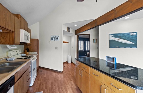 ...in the trees and lake side. The Living Room includes a flat screen TV, wireless internet and access to the deck. Dining and Kitchen will have plenty of seating for your group and all the accoutrements of home. They include full sized refrigerator, range, microwave, dishwasher and other small appliances such as toasters and blenders. Also located on the main level is the King bedroom. This bedroom features a flat screen TV, full bathroom and stack washer and dryer.