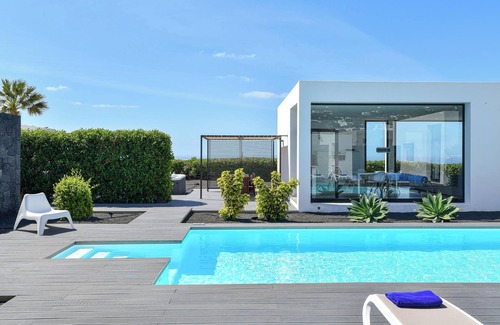 Holiday Villa Iconic is situated in Macher close to the coast and Lanzarote’s stunning volcanic craters. The 190 m² villa consists of a living room, a well-equipped kitchen with dishwasher and coffee machine, 3 bedrooms as well as 3 bathrooms and can therefore accommodate 6 people. Additional amenities include Wi-Fi (suitable for video calls), air conditioning and a satellite television. A cot and highchair are also available upon request. Outside, there is a private heated pool, garden, covered terrace, whirlpool and grill. The island’s volcanoes make for a fantastic backdrop and are visible from inside and outside the villa. The nearest supermarket is just 5 minutes drive away (2.5km). In the nearby town of Puerto del Carmen, you will find many shops, bars and restaurants, as well as the nearest beach (Playa Chica), which is just 7 minutes by car (5km) away. The island’s airport is also easy to reach, being just an 8 minute drive (9km).