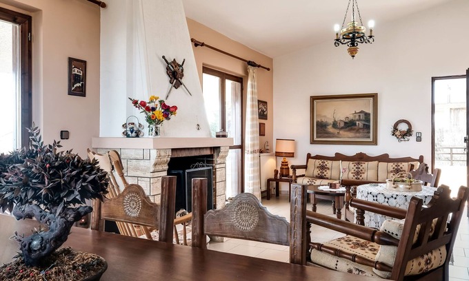 This elegant cottage in Tanagra, Central Greece is perfect for a getaway with your favorite group. A veranda in the cottage offers panoramic views of the sea while you enjoy your morning cuppa. Parking is on-site.