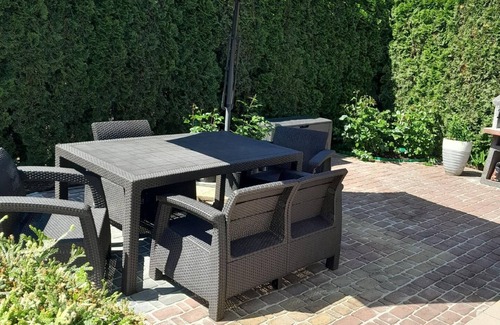 Detached house of 150 m2 on a plot of 450 m2. On the ground floor: kitchen and living room with dining area, on the first floor there are three bedrooms and a bathroom with toilet. On the fenced property there are two parking spaces, a barbecue area and a relaxation area. The house is located in a quiet area, close to the town centre and the beach. The kitchen is equipped with the following appliances: dishwasher, fridge, induction hob, coffee machine, toaster and kettle. The dining room has a table and 6 chairs. The living room has a sofa, table, fireplace and a 70-inch Sat TV with international channels. Internal entrance to the property. The bathroom is 12 m2 and has a bathtub, shower, toilet, sinks and washing machine. Guests have access to the garden with garden furniture, parasol and barbecue. The owner lives at the rear of the property. The property has gas heating, additional charges for usage (according to consumption).