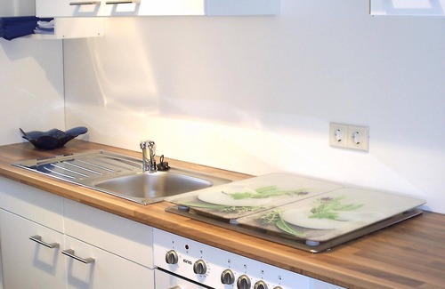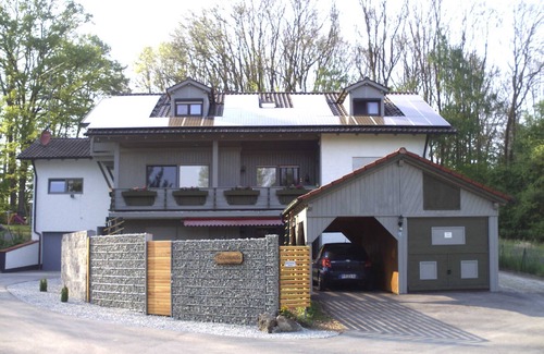 Sunny cozy, well-equipped apartment, partly renovated, 52 square meters, with sep. Entrance, living room / bedroom separated, complete. kitch. Kitchen with dining area, coffee machine, water egg cooker, toaster, radio, SAT-TV-LCD 80 cm, ZH, shower / WC, covered terrace with seating and own loungers, lawn, large parking lot, animals on request, extra charge 2.10 € / Day, transfer from the train station Karpfham, bread service, bike path in direktb. Close. In the living room there is another add. Bed (for third Person or separate sleeping possible).