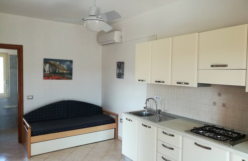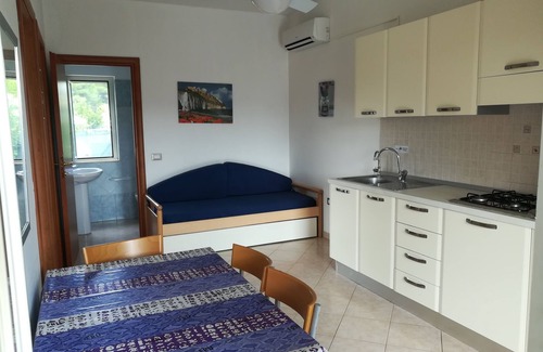 The villa's kitchenette provides everything you need to prepare delicious meals during your stay, with a convenient sofa bed located nearby for additional seating or sleeping arrangements. Enjoy your meals al fresco on the veranda, surrounded by nature and soaking up the warm Italian sunshine.
