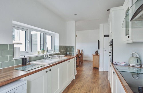 Meanwhile, the open-plan dining room/kitchen is the perfect place to savour delicious meals and chat about your day. The modern fitted kitchen provides everything you will need to self-cater with ease, including an electric hob and oven, a kettle, a dishwasher, a fridge/freezer and a washer/dryer, while the dining room comfortably seats six with a Smart TV on the wall.