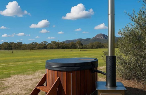 Escape to Hollow Mountain Getaway 2 by Tiny Away, a peaceful cabin retreat in the stunning Northern Grampians, Victoria. Soak under the stars in your private firewood hot tub, surrounded by breathtaking mountain views and iconic hiking trails. Perfect for couples or solo travellers, this spacious tiny house blends cozy charm with modern comfort.