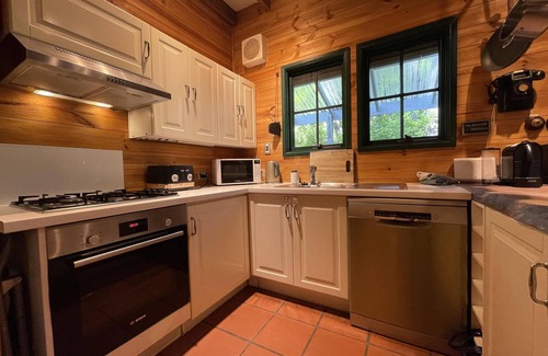 The chalets warm and welcoming atmosphere is complemented by tasteful furnishings and charming rustic details throughout. At the heart of the home, the inviting lounge features a large open log fireplace and an additional combustion fireplace, creating the perfect setting for cosy evenings. The generous dining area, seating eight, opens onto a covered veranda where you can relax to the soothing sounds of nature and enjoy visits from colourful native birdlife.