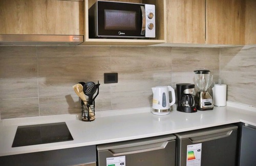 🍽️ Cocina completamente equipada con refrigerador, cafetera, juguera y tostador