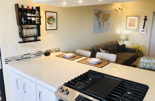 Comfortable 2-bedroom with full kitchen and ocean views. Can also be booked with Paradise Found pool villa next door to create a perfect 3 bedroom situation. Full kitchen with 4 burner gas stove, full sized fridge and outside patio dining area in addition to bar seating. Small deck, views to St. Croix. Parking in front, no steep hills or 4WD required. Full AC, Internet, 55" TV in living room and bedroom, both with Amazon Firestick. Quick 5 minute drive to Cruz Bay, 2 minutes to grocery store and gas.
