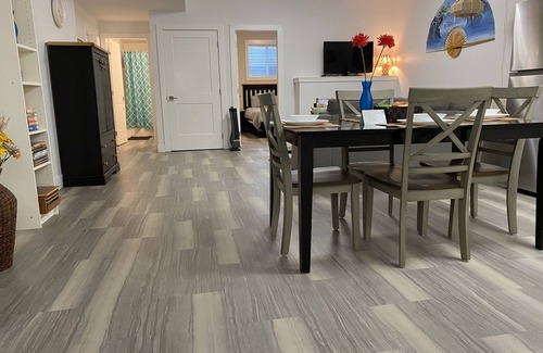 The fully equipped kitchen features top-of-the-line appliances, dishes, cookware, baking equipment, a toaster, and all necessary utensils. We also provide oil, vinegar, spices, sugar, creamers, teas, cocoa, and organic coffee. In the bathroom, you'll find towels, a hair dryer, as well as basic toiletries such as shampoo, conditioner, and shower gels. We offer hot water on demand and provide an in-suite washer/dryer with detergent and softener included. The bedroom boasts a comfortable queen-sized mattress, while the living room offers a sofa bed with a plush mattress topper. The suite has its own private entry, accessed via a set of 15 stairs. Please note that this home is not suitable for parties or events, and only registered occupants are allowed overnight stays. There is ample parking space available.