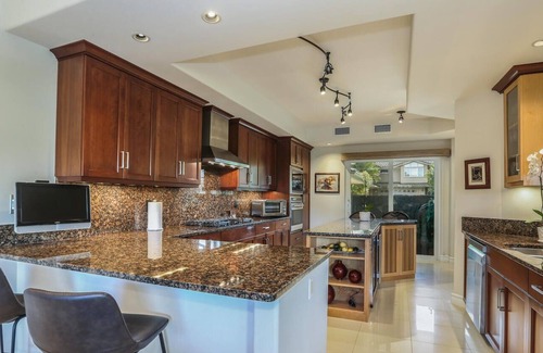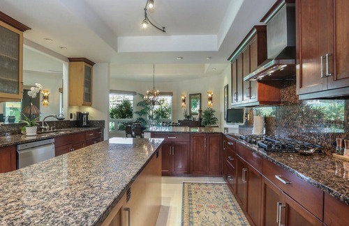 Enter into Hale Moana’s bright and spacious wraparound common areas that display high-vaulted ceilings, large sliding doors, ceiling fans, ample window displays as well as a skylight, offering ample light and airflow throughout the space. The living area is furnished with a plush leather couch & armchair and a large flatscreen smart TV mounted above the toasty fireplace, making it the perfect setting for hosting social gatherings or laying low and enjoying a cozy movie night. Around the corner is the deluxe gourmet kitchen, outfitted with all stainless steel appliances, smooth granite countertops, a large island counter, and a double wine chiller, making any chef feel right at home while whipping up some culinary delights to be served at the formal dining table that seats 6 guests under the opulent chandelier.