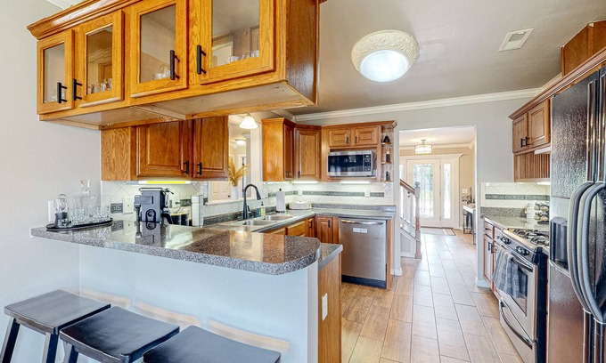 Even though the home is all about entertainment and creating everlasting memories with your loved ones, this retreat also caters to the needs of remote workers or students with two dedicated workstations. Each is equipped with electric adjustable standing desks, monitors (a dual 27-inch monitor and an external 23-inch monitor), and a laptop stand. Both also offer a convenient docking station. The home also includes a Super Mario-themed gaming bunk room that will please the kiddos in your group. This one-of-a-kind room includes a Nintendo Wii and retro Nintendo gaming systems. Additional perks include dog dishes, a fenced backyard, a large washable pet bed, board games (Monopoly, Apples to Apples, Cranium, Nintendo Retro, Nintendo Wii, and puzzles), and an on-site washer/dryer.