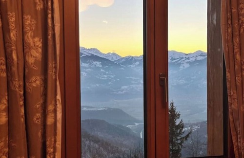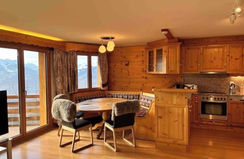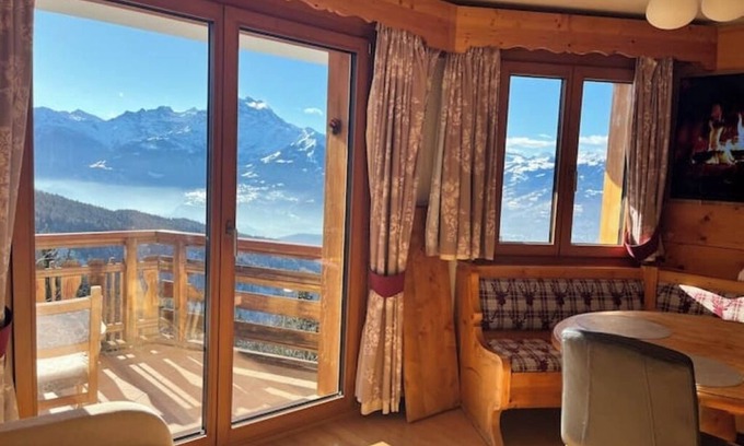 Immerse yourself in the warmth and comfort of a chalet-style 3 bedroom apartment nestled in the former Hotel Bristol, offering spectacular views overlooking mountain peaks Muveran, Dents du Midi, Mont Blanc massif, and the Rhone valley.