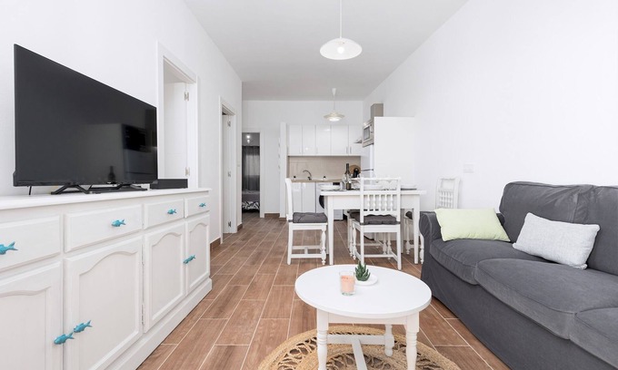 This cosy accommodation is perfect for a couple's getaway, friends or solo travellers looking to unwind by the sea. Sleeping up to 4 people, it offers two bedrooms, the main bedroom with a double bed, storage space and a relaxing atmosphere that invites you to rest, the secondary bedroom has a bunk bed. It has a full bathroom with shower and an open concept living area with fully equipped kitchenette with everything you need, a living room with a comfortable sofa ideal for relaxing, 50’ Smart TV with some international channels in German and English and direct access to a terrace where you can enjoy the sea breeze and the sunsets of Tarajalejo. For greater comfort, it has high speed WiFi and a fan.