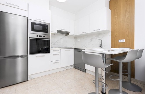 The flat has a fully equipped kitchen with all the necessary appliances for a comfortable stay, including fridge, oven, microwave, dishwasher, washing machine, toaster, kettle, juicer and coffee maker. It is also equipped with a television, iron and hairdryer, so that you will have everything you need during your stay.