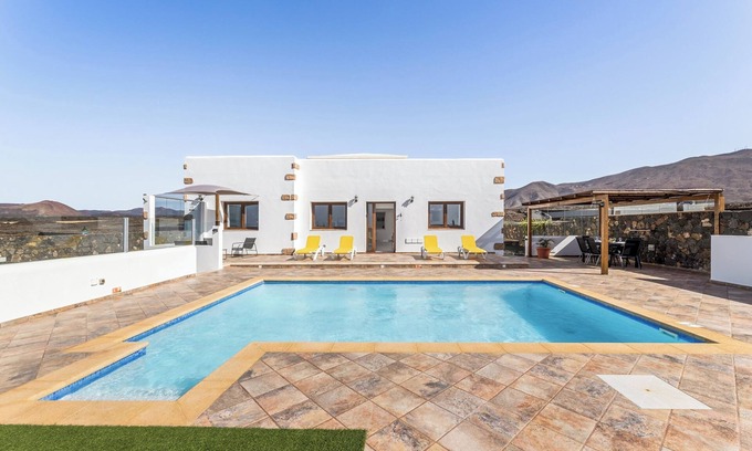 Beautiful villa with private pool in Yaiza, in the south of Lanzarote, in a quiet and exclusive environment. This modern property, perfectly distributed on a single floor, offers an ideal space to enjoy an unforgettable holiday. With 4 spacious bedrooms and capacity for 7 people, the villa guarantees comfort and privacy. It has been decorated with attention to detail, and an outdoor space with solarium, and private swimming pool, where you can relax and enjoy the good weather.