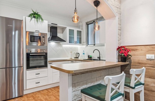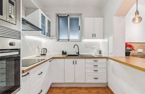 The flat has a fully equipped kitchen with fridge, coffee machine, oven, microwave, kettle, juicer, toaster, barbecue, washing machine, iron, hairdryer, air conditioning, heating, fibre WiFi internet, sun loungers, towels, bed linen and much more.