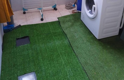 The house features a fan, cleaning products, ironing equipment, a vacuum cleaner, a washing machine, mosquito nets and a dryer.