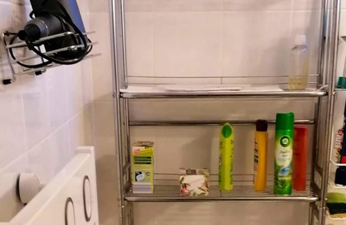 The apartment features ironing equipment, a vacuum cleaner, cleaning products, a washing machine and a fan.