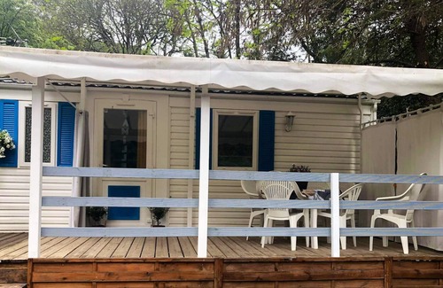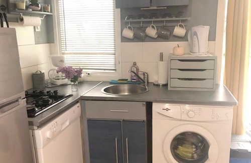 The bungalow features a washing machine, ironing equipment, cleaning products and air conditionning.