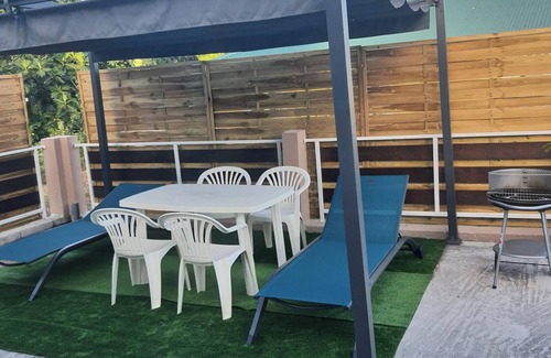 Outside, you'll find a lovely enclosed garden where you can unwind on the furniture, barbecue, and bask in the sun on the loungers. The terrace offers a stunning view of the garden, making it the perfect spot for outdoor meals with family and friends.
