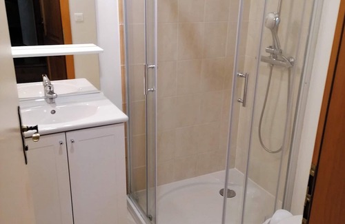 - 1 bathroom with shower and toilet.