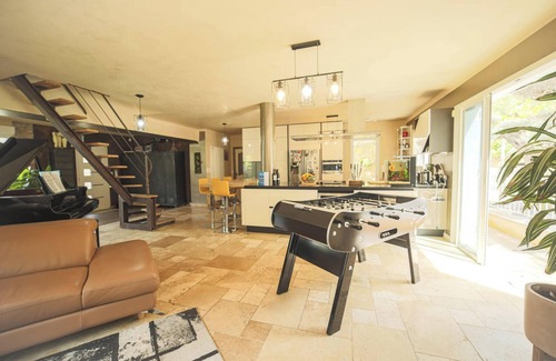 Discover a beautiful villa in Aubagne, perfect for family getaways or a holiday with friends. Enjoy your own private swimming pool, jacuzzi and summer kitchen with pizza oven. Accommodating up to 12 guests with access to foosball, there is something for everyone.