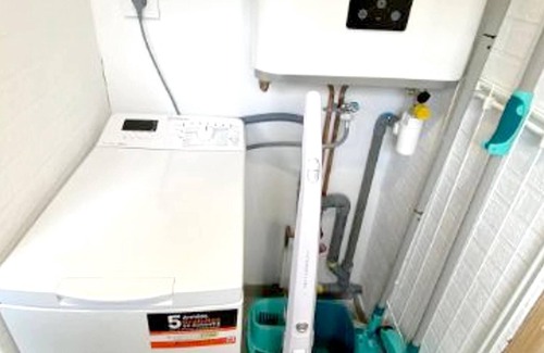 The house features air conditionning, a washing machine, ironing equipment, a vacuum cleaner, cleaning products, a fan and a jacuzzi.